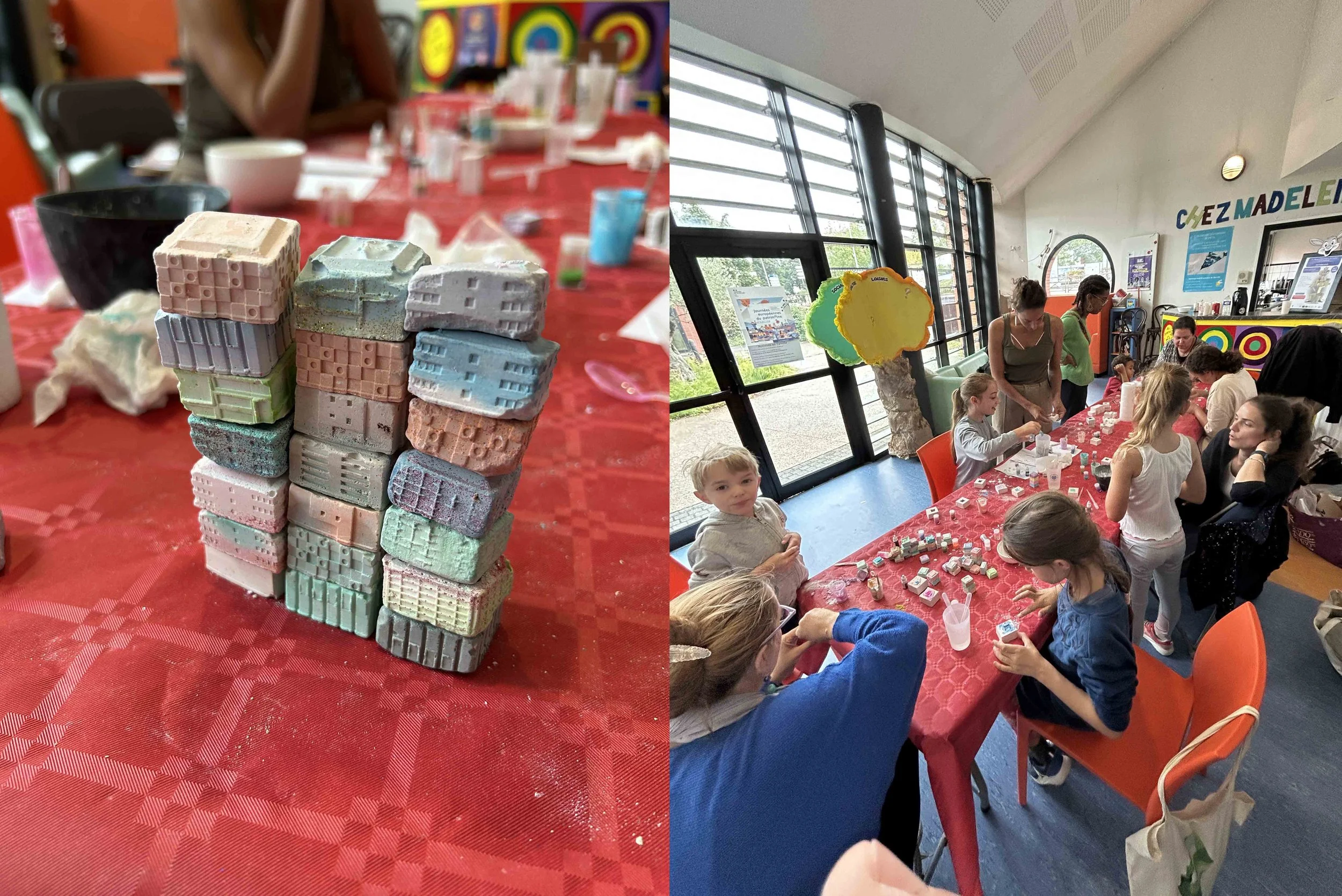 🎨 Création de blocs brutalistes en plâtre coloré et pailleté : chaque enfant apprend à utiliser une pipette, à réaliser les bons mélanges plâtre-eau, et à intégrer des additifs de couleurs et de paillettes pour personnaliser ses blocs.