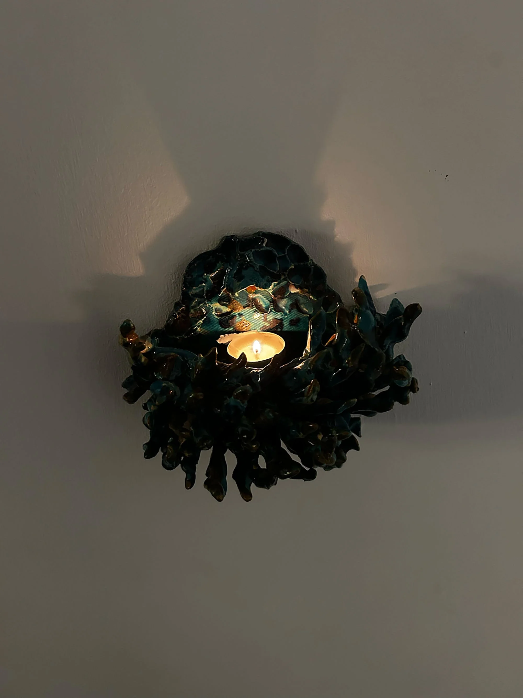 A sculptural wall-mounted candle holder (approx. 20 × 20 × 20 cm), designed for both indoor and outdoor use. It accommodates a small floating candle, offering a soft, ambient glow.